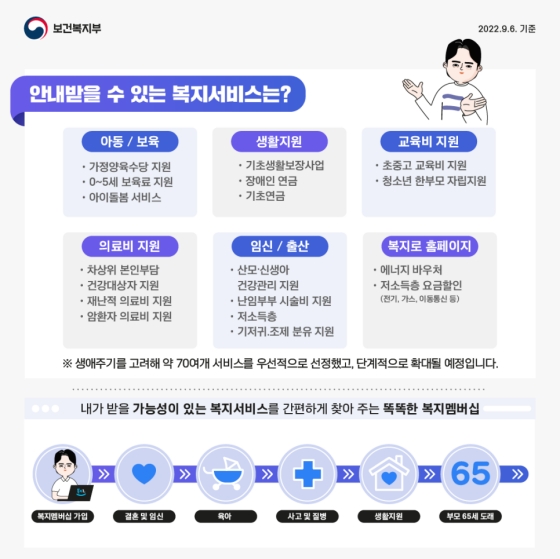 안내받을 수 있는 복지서비스는 각각의 생애주기에 맞추어 70여 개의 중요한 서비스가 선정되었으며, 단계적으로 확대해 나갈 예정이니 신청하시길 바랍니다.