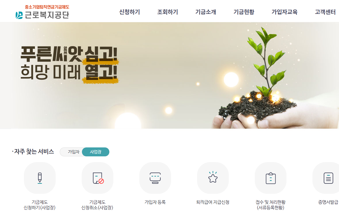 중소기업 퇴직연금기금제도는 근로복지공단 퇴직연금 홈페이지에서 직접 온라인 가입이 가능합니다.