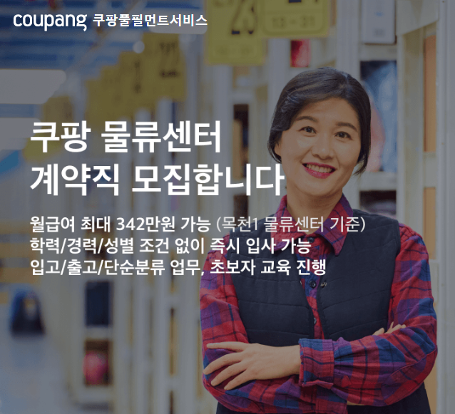 고물가에 경기는 바닥이고 월급은 통장을 스쳐 지나간다는 말이 나올 정도로 점점 돈의 가치는 없어져 직장이나 아르바이트를 알아보시는 분들이 많으신데요. 쿠팡 물류센터 계약직 모집이 있어 알려드리니, 간편 지원해 보세요.