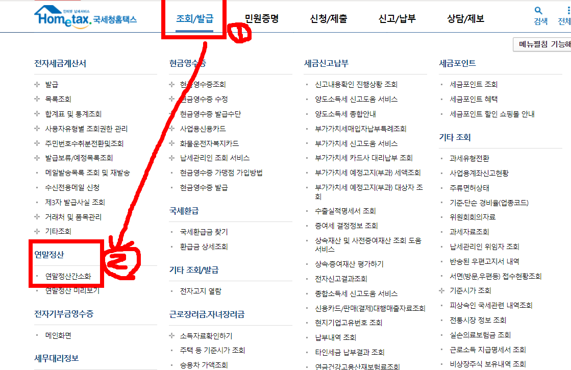 맨 위쪽 상단에 조회/발급을 클릭하시면 [연말정산간소화] 에서 확인이 가능합니다.