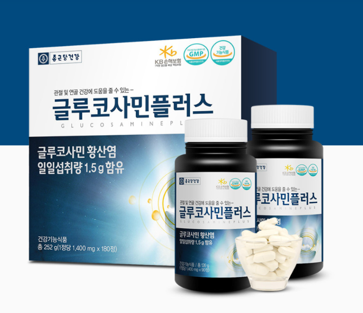 종근당건강 글루코사민플러스는 관절 및 연골건강에 도움을 줄 수 있는 제품으로 1일2회, 1회 1정 섭취기준으로 3개월분의 넉넉한 용량이며, 건강관리가 필요한 중장년층은 꼭 채워야 할 성분입니다.